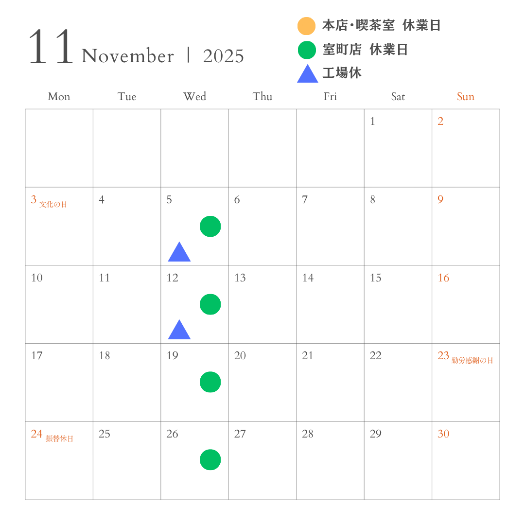 お知らせ 2025.10.15 休業日のお知らせ 日頃より永楽屋をご愛顧いただきまして、誠にありがとうございます。誠に勝手ながら下記お日にちを休業日とさせていただきます。 ※高島屋京都店・大丸京都店・大丸梅田店・本社売店は通常通り営業しております。お客様には大変ご迷惑をおかけいたしますが、何卒ご理解を賜りますようお願い申し上げます。