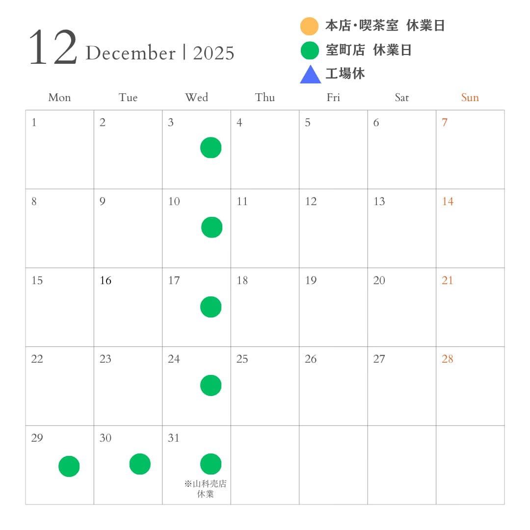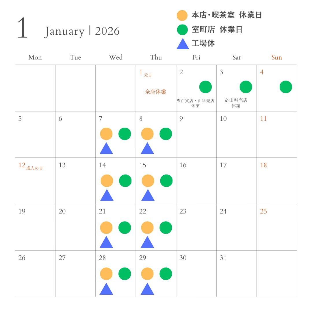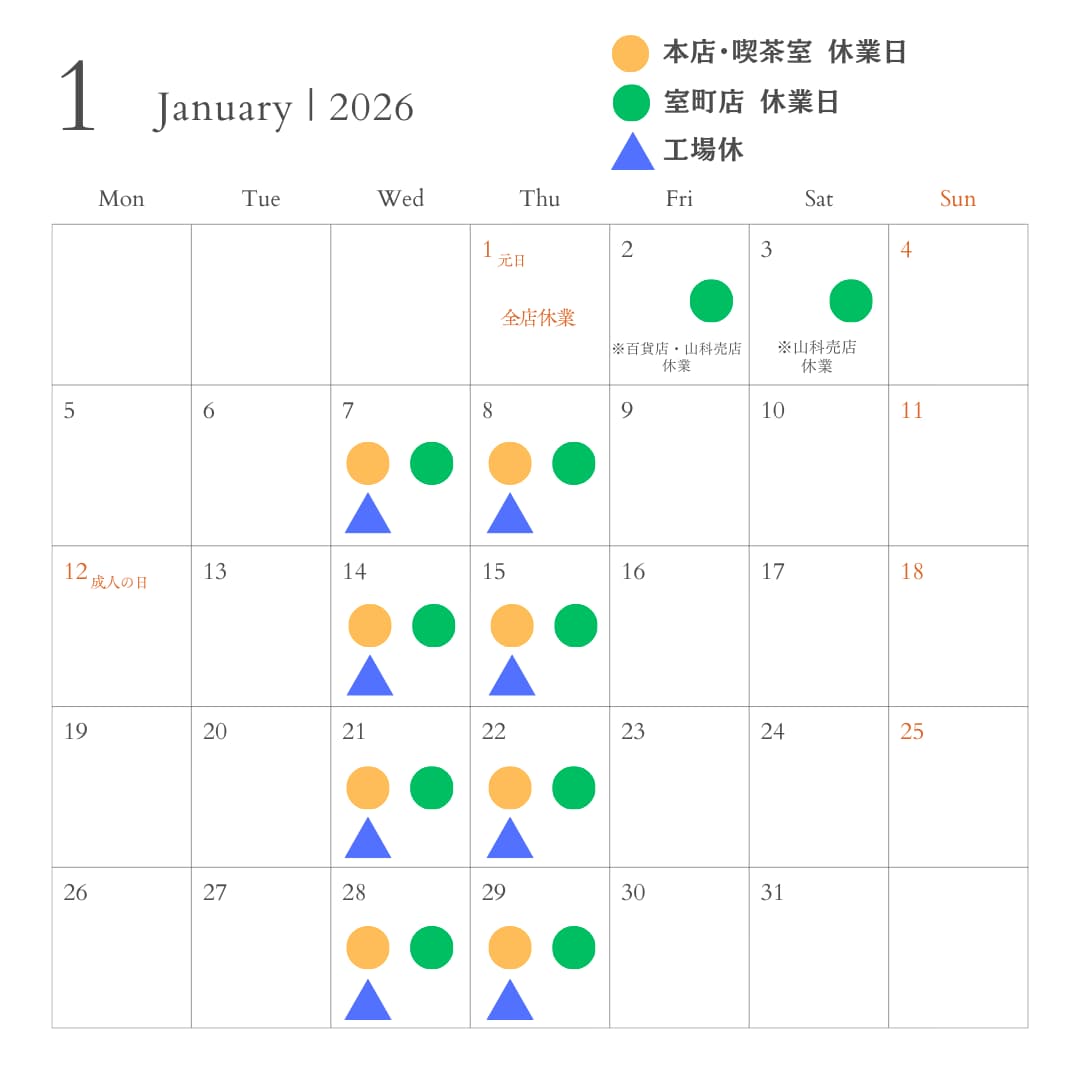 お知らせ 2025.12.15 休業日のお知らせ 日頃より永楽屋をご愛顧いただきまして、誠にありがとうございます。誠に勝手ながら下記お日にちを休業日とさせていただきます。 ※高島屋京都店・大丸京都店・本社売店は年末年始を除き、通常通り営業しております。お客様には大変ご迷惑をおかけいたしますが、何卒ご理解を賜りますようお願い申し上げます。